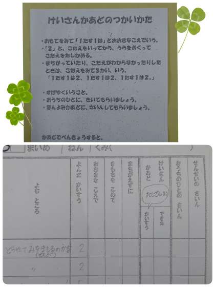 今日から計算カードの宿題があることを先生が子ども達に説明をしていました。音読カードと計算カードが一緒になったカードに替わっています。計算カードの使い方についてはプリントを貼っていますので、お子様と一緒にご確認ください。