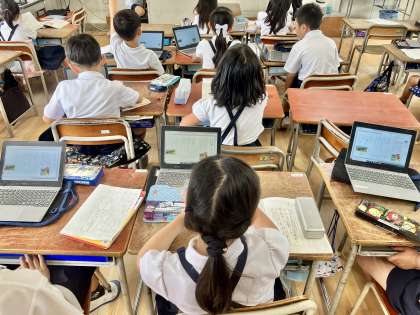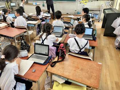 学習者用端末で、教科書を見ると横スクロールで全面見ることができます。子ども達は、学習者用端末を活用しながら、学習していました。