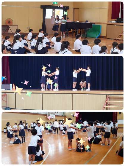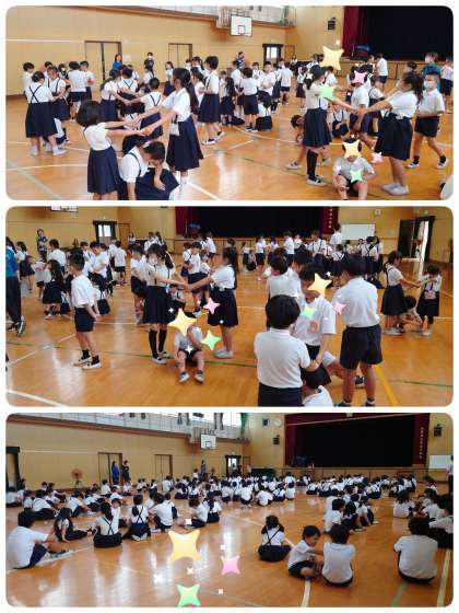 集会委員の子ども達が舞台の上で見本を見せてくれたのでルールがよく分かりました。高学年が下の学年の子ども達をリードしてくれたのでみんなで楽しむことができました。