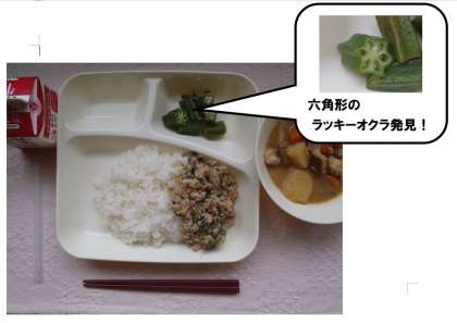オクラは五角形がほとんどですが、時々、六角形や七角形のものが混じっています。珍しいので、中浜小学校では、ラッキーオクラ♪と呼んでいます。