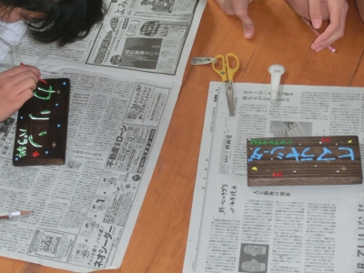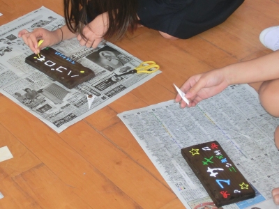 11月24日(火)6限、6年生は体育館で「創立100周年記念式典」の練習を行いました。その後、林間学習でお世話になった宿舎から送っていただいた「焼き板」に、ペイントで樹名を書いていきました。
