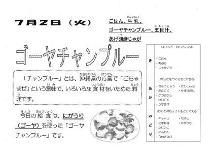 ゴーヤと言えば苦いものの代表ですが、給食のゴーヤチャンプルーは、そんなに苦くありません。中綿を取って、塩で下味をつけている間に苦味が減っていきます。「食べられるかな」と心配していた人も、かつおぶしの風味も手伝って「大丈夫」と食べていました。