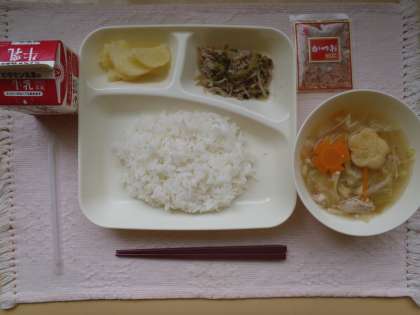 五目汁の中に、うすあげの花を発見しました。食缶のふたを開けるとラッキーあげさん♪とラッキーにんじん♪が浮いていて、「かわいい」様子にみんな喜んでいました。味もだしがきいていておいしく、食欲がわいてきます。