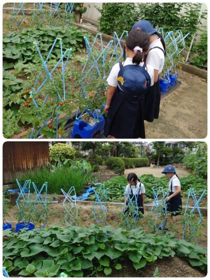 「〇〇ちゃんのトマト、いっぱい赤くなってる。」