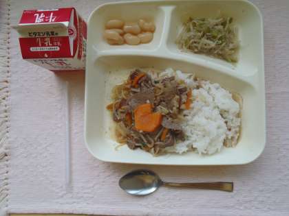 歯ごたえの良いもやしとピーマンのごまいため、甘辛い味の大福豆の煮ものと一緒に今日もしっかり食べました。