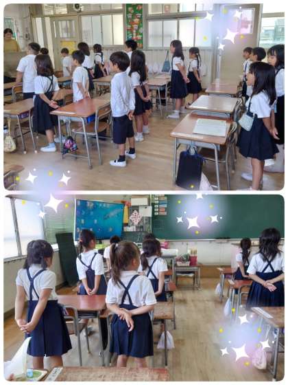 5時間目の終わりごろ、1年生の教室をのぞくと音楽の時間でした。担任の先生が「校長先生に元気な声で校歌を聴いてもらいましょう。」と子ども達に声をかけてくれました。入学してから3か月と少し。子ども達は校歌をしっかり覚えて、元気な声で歌ってくれました。担任の先生と2人で「とっても上手。」と、ほめるとにこにこの笑顔が返ってきました。