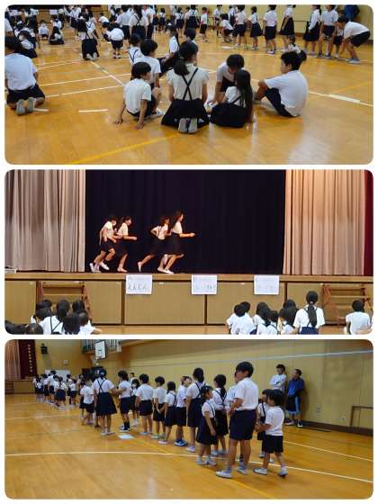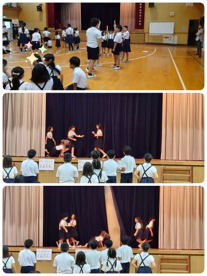 いろいろな仮装をする人が登場するたびに子ども達はくすくす笑っていました。最後の問題には、みんなが声を出して数え始めたくらい楽しかったようです。なかよし班での活動は高学年が上手にリードしてくれるので下の学年の子ども達は楽しそうにゲームに参加しています。1学期の児童集会は今日が最終でした。2学期も楽しい活動ができるように集会委員の子ども達ががんばります。