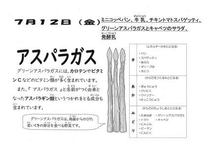 トマトの赤とグリーンアスパラガスの緑が対照的な鮮やかな献立です。トマトやドレッシングの酸味で食欲が出ます。