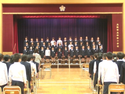 6年生は舞台前のひな段に並び、一人一人が「おめでとう」という気持ちを込めて、「喜びのことば」をつないでいきました。明後日は、最後の練習となる予行を行います。