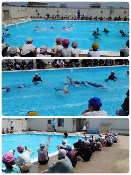 今日は、3年生以上の学年で着衣水泳をしました。水着で泳いでいる時と、その上にシャツやズボン、靴下などを身につけて水の中に入った時とを比較してどんな感じがするのか体験しました。水の中で走ったり泳いだりするのは重くてとても大変です。