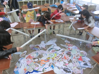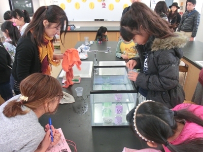 体育館で吹奏楽部の演奏【写真左】を聴いたのち、各教室のゲームコーナーに移動しました。理科室では「コイン落とし」【写真中】を、2階の教室では「魚つりゲーム」【写真右】を行いました。