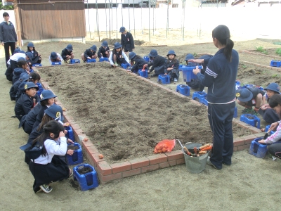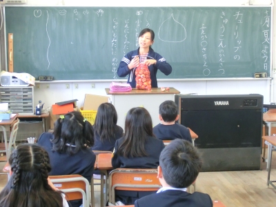 3限は、学習園においてる個人の植木鉢の土を掘り返して柔らかくし、球根をそっと植えました。来年の入学式に、どんな色のチューリップが咲くか楽しみです。