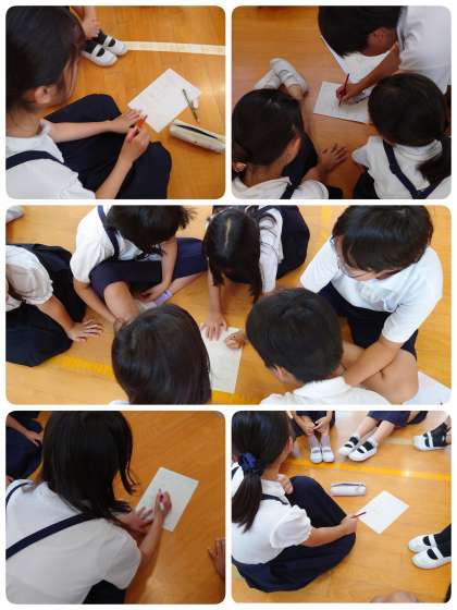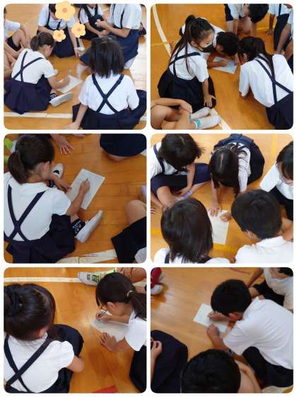 今日の児童集会は「イントロゲーム」でした。問題は全部で5問。音楽の最初の部分だけ聴いて曲名をプリントに書いていきます。どのなかよし班もみんなの力を結集です。分かる子どもが答えを書いていきました。おかげで全問正解の班がたくさんありました。