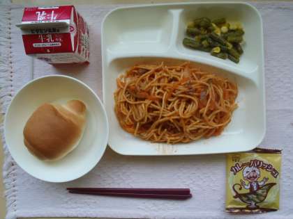イタリアンスパゲッティはとても人気のある献立です。口の周りをオレンジ色にしてツルツル食べる人、パンにはさんでガブリといく人、いろいろです。