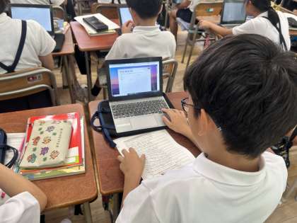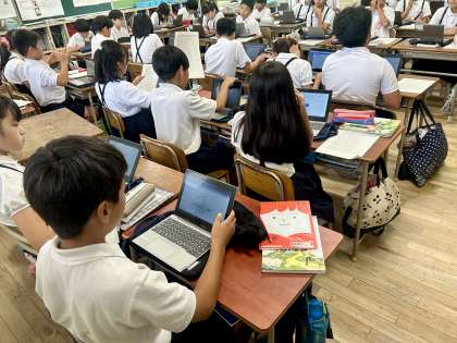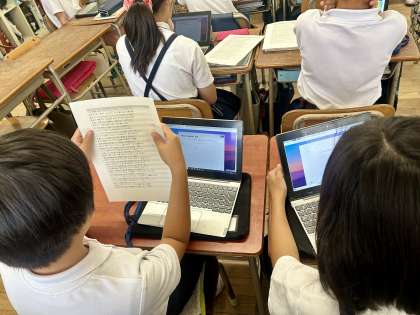 今日は、5年生が学習者用端末を使って、学級の子ども達が作った俳句の鑑賞をしていました。隣の友だちと話し合いながら、お気に入りの一句を選んで投票していました。