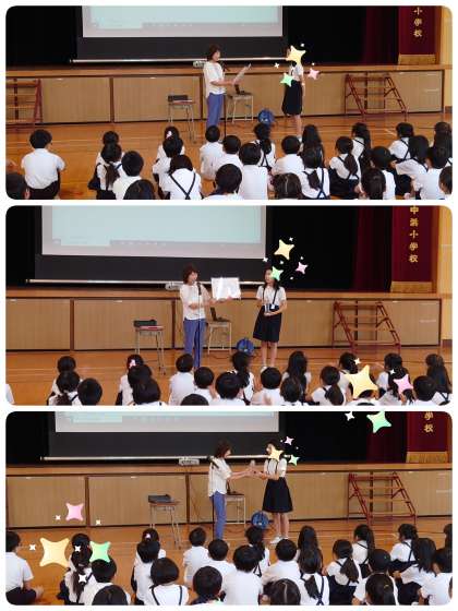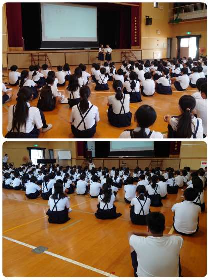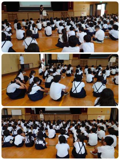 今日の児童朝会で、この夏、大阪市のミニバスケットボールの大会で、中浜小学校の6年生の子どもが所属している「城東スーパーラビット」が優勝したので、表彰状とクリスタルのトロフィーを渡しました。全市で優勝とはすごいです。みんなから大きな拍手をもらってとてもうれしそうにしていました。おめでとう!