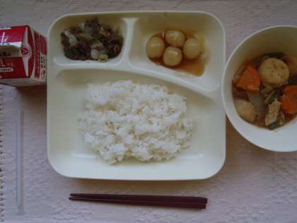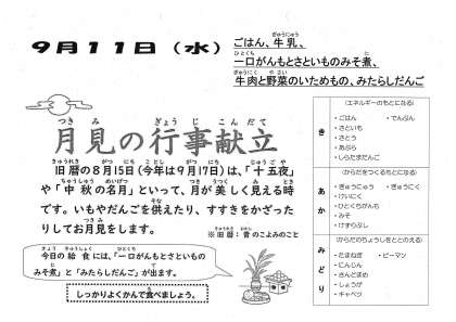 月見の時は、丸いものを食べる風習があります。今日の給食では、みたらしだんごと、煮ものに入っているさといもです。そう言われて煮ものを見て、「一口がんもも丸い」と言っている人がいました。うん、確かに丸い。