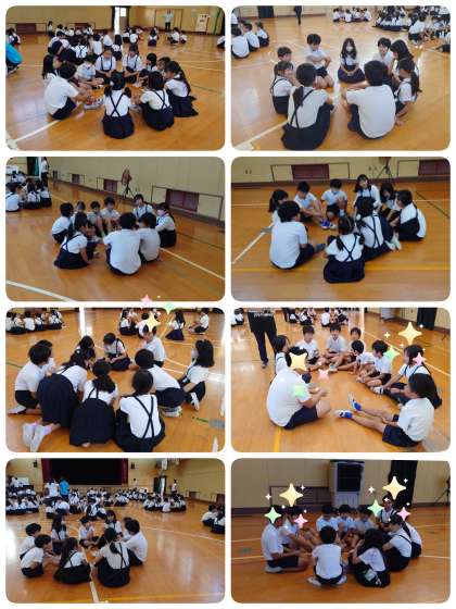 今日の児童集会は、「古今東西」でした。まず、なかよし班で円を作ります。集会委員がお題を言い、なかよし班のメンバーでリズムよくお題に合った言葉を順に言っていく遊びです。
