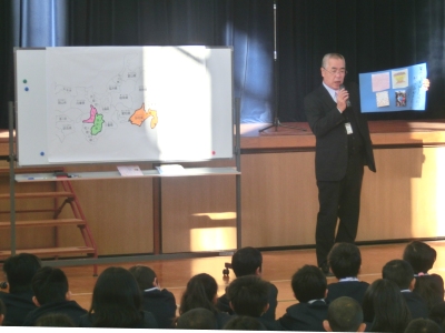 12月7日(月)、今日の「児童朝会」では、校長先生からエコ風船(太陽の光で自然生分解される素材)の「お祝いメッセージ」の返事について、どこから来たのか日本地図を拡大して説明【写真左】がありました。