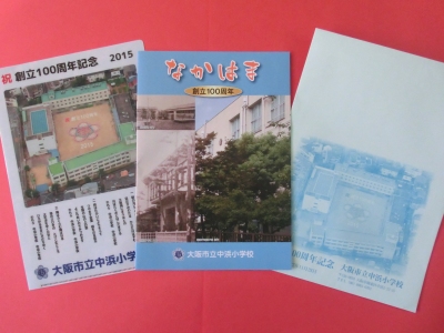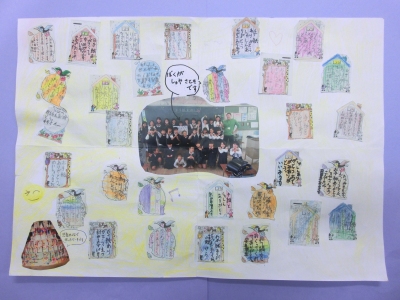 奈良市、静岡県浜松市・牧之原市からは小学生のお友達、静岡県河津町からはご年配の女性から返事があったということと、それぞれのお手紙の紹介がありました。小さな風船が、約400km離れたところまで飛んで行ったのは信じられません。全児童・教職員が「中浜小学校100才のお誕生日」を祝う気持ちが、4つの風船に伝わって、返事をいただくことができたと思います。2年1組では29名全員が寄せ書き【写真中】をし、創立100周年記念誌【写真右】と一緒に、奈良市のお友達に送りました。