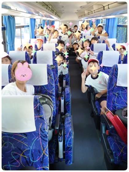 バスに乗って、中浜小学校に向かっています。子ども達は、ちょっとお疲れ。寝ている子も多いです。