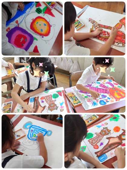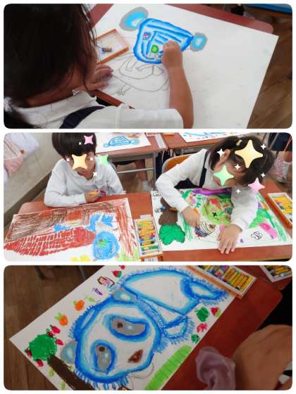 バスの中から仲間の色を3つ決めて、重ね塗りをしながら自分の好きな動物を画用紙いっぱいに描いています。ライオン・トラ・コアラ・パンダなど、いっぱい重ね塗りをしているので、パスの箱の中にはないステキな色ができて、子ども達はとっても満足そうです。楽しいお絵描きの時間になりました。