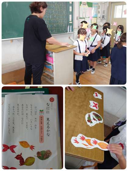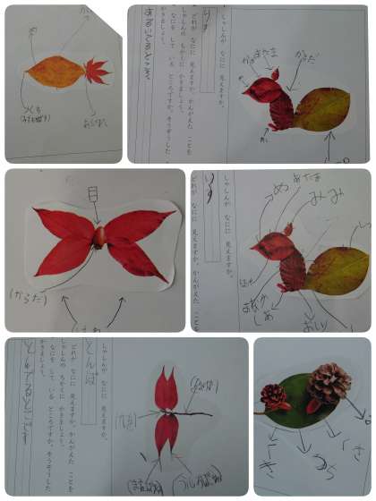葉っぱや木の実を並べると、いろいろなものに見えてきます。あなたは何に見えますか。思ったことを、先生や友達と話しましょう。