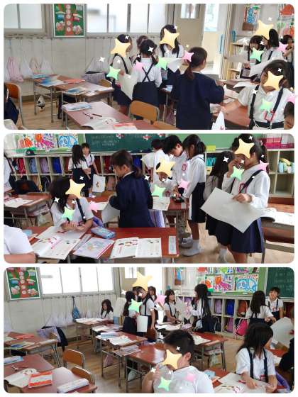 ワークシートに書き込んでから、フリートークを始めました。1年生も自分の考えを友達に伝える学習を進めています。