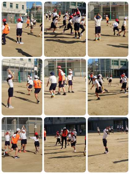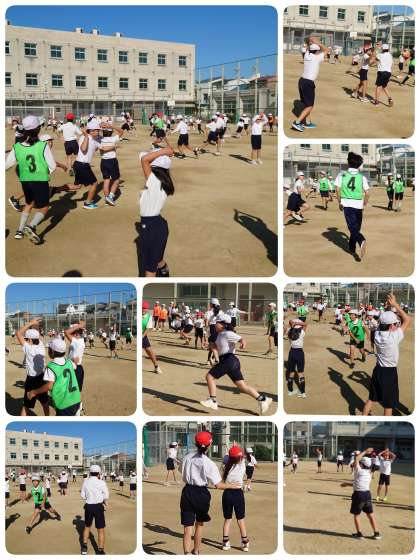 その後「進化ジャンケン」をしました。オニは6年生。オニに捕まったらバナナになります。逃げている人にタッチしてもらえたら、片方だけ手を下げることができます。もう1度逃げている人にタッチしてもらえたら、もう片方の手も下げることができ復活します。