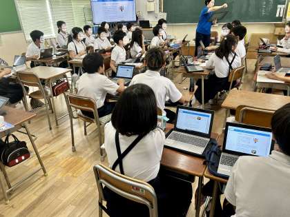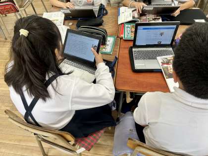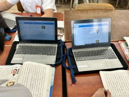 国語科の学習です。教科書のQRコードを読み取り、資料を子どもたち同士で読み取り、話し合いを深めていました。