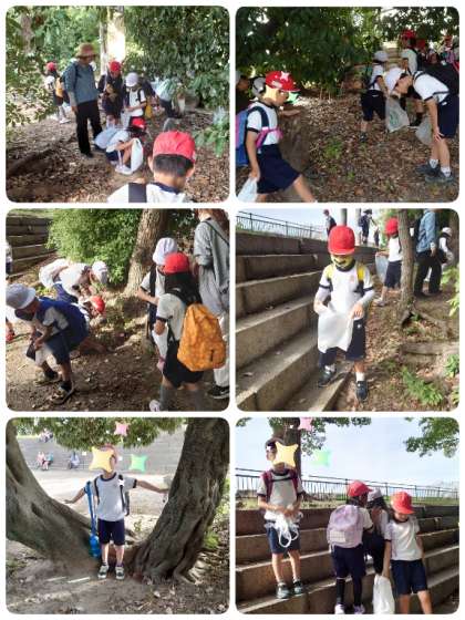 午後は、低・中・高学年に分かれて活動しました。1・2年生はどんぐり拾いをしました。3・4年生は秋の生き物さがし、5・6年生はピースおおさかの見学。写真は1・2年生の様子です。