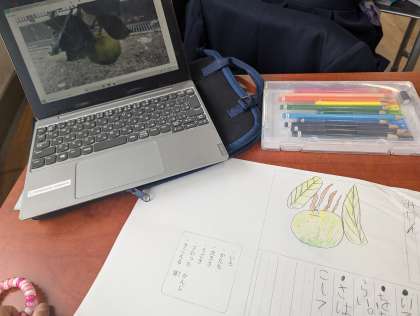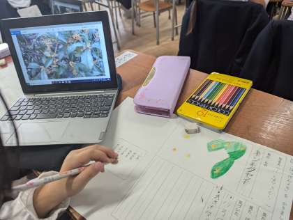 1年生では、国語科で「はっけんメモをかこう」の学習に取り組んでいます。学習園や学校の周りで気になったもの・興味を持ったものの写真を撮り、発見メモにまとめています。色や形、大きさなど、様々な観点をもってよく観察し、たくさんの発見をして学びを深めました!!