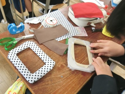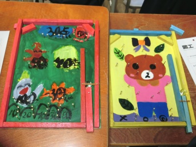 2年生【写真左】は、算数の時間でかけ算の「81マス計算」をしていました。これまでは足し算、引き算の「100マス計算」でしたが、九九を応用した計算プリントに変わりました。4年生【写真中】は、図工の時間で、完成した「コリントゲーム」の作品鑑賞カードを書いていました。初めてノコギリを使い、釘打ちをして、ニスを塗って、やっとできあがりました。6年1組【写真右】は、図工の時間で小学校時代の思い出の写真を入れる「フォトフレーム」を作っていました。フェルトや毛糸、飾り物をそれぞれが用意し、個性的な作品に仕あげているところでした。