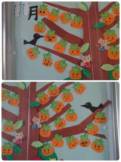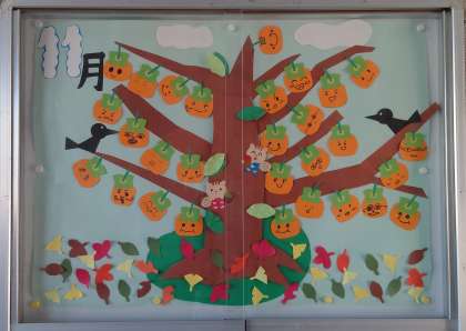 11月の玄関掲示の紹介です。今月は2年生が作ったカキの実が勢ぞろいです。一つ一つのカキの実の顔を見ていると子ども達の顔がうかんできます。学校に来られた時はぜひ見てください。