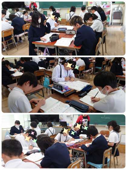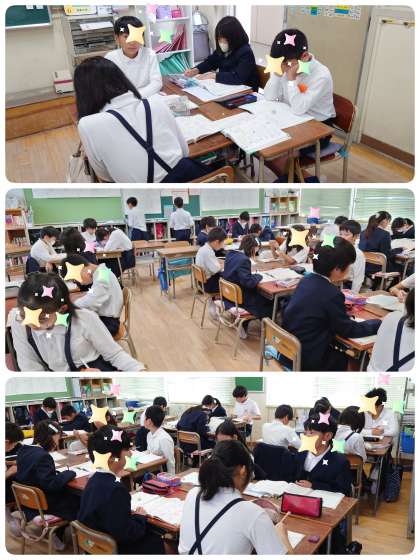 5年生がグループに分かれて活動をしていたので、今は何をしているのか尋ねると「テスト対策です。」と答えてくれました。テストに備えてグループで教え合いをしているようです。どのグループも遊んでいる子など一人もいません。「なぁ、この問題の解き方分かれへんねん。教えて。」「あ〜、これは・・・。」と、自分から分からない、教えてとSOSを出すと、グループの誰かがとても分かりやすく教えてくれます。他の子も身を乗り出して話を聞き、「わたしも分かったわ。」とうれしそうにしていました。自分達で学習を進める力がどんどん育ってきている5年生です。