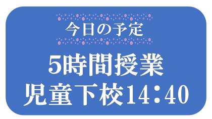 今日は、お手紙等でもお知らせしていますが、全学年5時間授業です。下校は14:40ごろになります。ご予定よろしくお願いします。