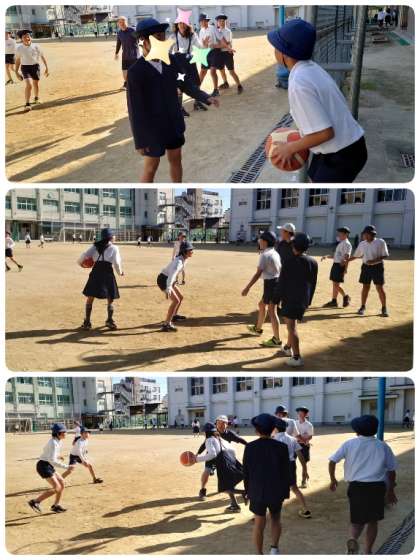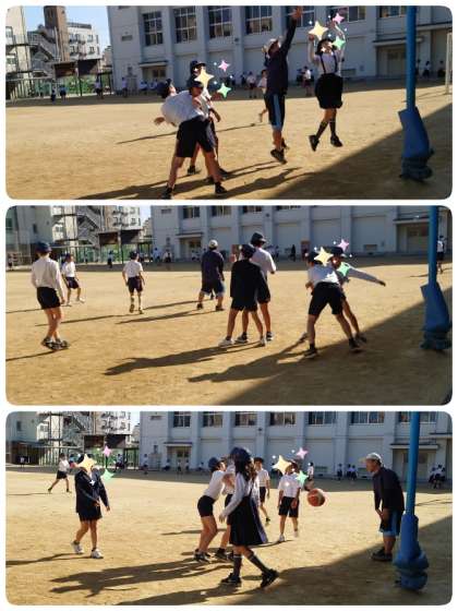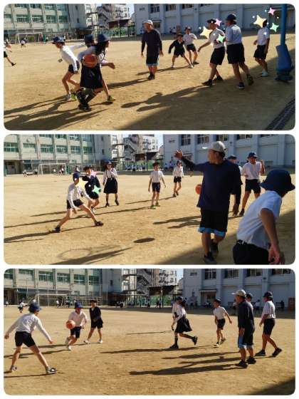 職員室に一番近いバスケットゴールは、6年生の子ども達が夢中になってバスケを楽しんでいます。教務主任の先生に「今日はいけますか?」と、一緒にバスケをするために声をかけにくる子もいます。みんなで仲よくバスケを楽しんでいるうちに、どんどん上手になっている子ども達です。