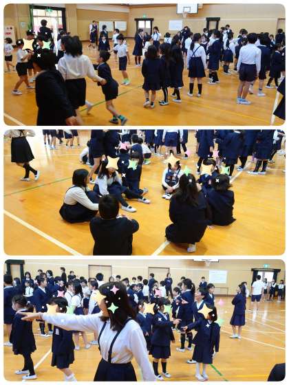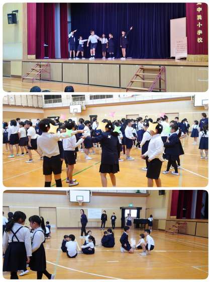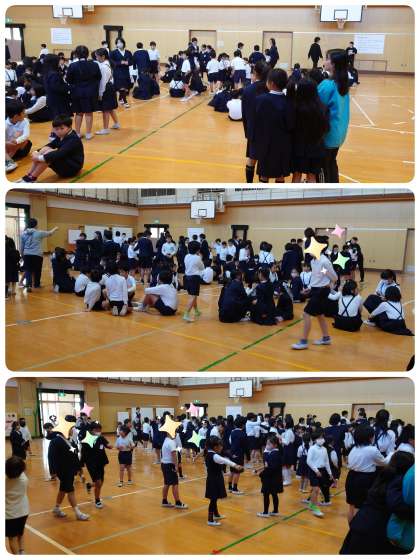 今日の児童集会は、「フルーツ狩りに行こうよ」でした。「フルーツ狩りに行こうよ。ハサミだって持ってるし、かごだって持ってるもん。あっ!あっ!!い・ち・ご。」となると、いちごは3文字なので3人集まって座るというゲームです。全学年ふりもしながら楽しみました。高学年もみんな一緒にはさみやかごを持っているふりや、何かを発見した時の「あっ!」と指をさすのも楽しんでいました。