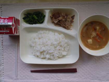 豚肉のしょうが焼きはご飯によく合う献立です。ほうれんそうのごまあえも、しっかりした味付けでご飯が進みます。