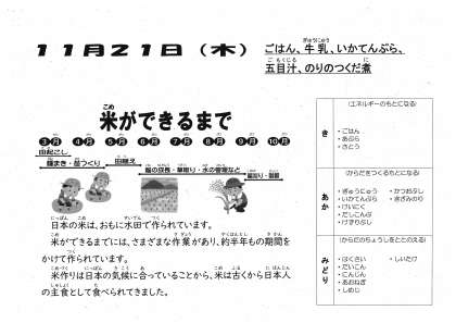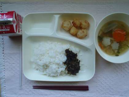ごはんに添えたのりのつくだ煮は給食室で手作りしています。自分の好きな量をご飯に乗せてパクパク食べていました。