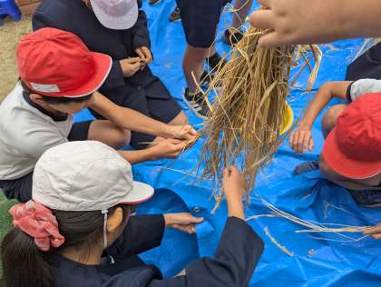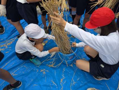 2時間目に学習園から楽しそうな声がたくさん聞こえてきました。様子を見に行くと、5年生の子どもたちが、もみすりをしていました。初めてする作業を、子どもたちは真剣に、そして楽しそうに取り組んでいました。おいしいお米になっていますように…!!