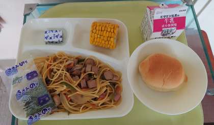 今日の給食のメニューは、ウインナーときのこの和風スパゲッティ・焼きとうもろこし・固形チーズ・ミニコッペパン・牛乳でした。