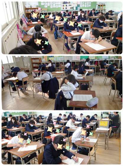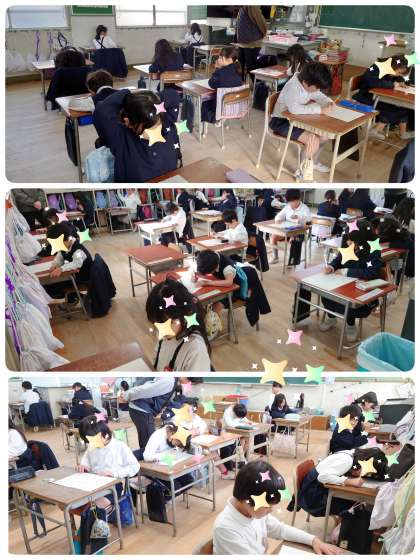 今日の5時間目、1年生から6年生まで全校一斉で学期末漢字テストを行いました。子ども達がいつもより字もていねいに書き、真剣に取り組んでいました。子どものやる気を感じました。ひとつひとつ一生けんめい勉強し、成果を出していく経験をこれからもたくさんさせていきたいです。
