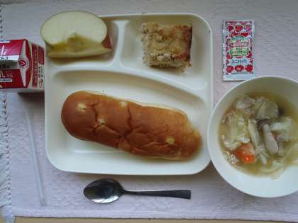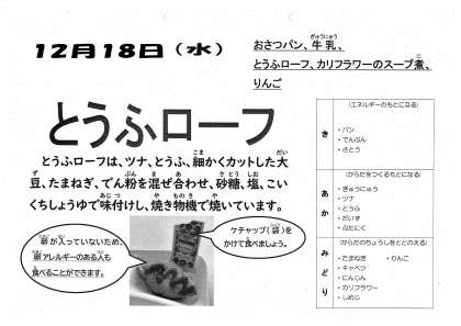 とうふとツナを主材としたとうふローフは、たまねぎがたくさん入っていて甘みを出しています。そのままでもおいしいですが、ケチャップをかけるとさらにおいしくなります。