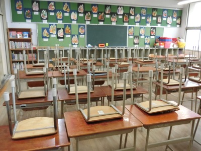 先生方は明日の「3学期始業式」を迎えるにあたって、教室等の準備にかかっています。年末に教室の床に樹脂ワックスをかけたので、今日は学習机・椅子を教室に戻す作業をしました。学校玄関の掲示も「お正月バージョン」に変わりました。明日は、集団登校に遅れないように、元気に登校しましょう。