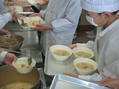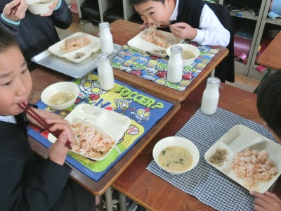 お雑煮は、新年を迎えるにあたって、その土地で取れるさまざまな食材をお供えし、お餅と一緒に煮込んでお正月に食べていたのが始まりです。具材や味つけ、餅の形、調理方法などは、地方や家庭によって違いがあります。小学校給食のぞう煮は、いわゆる関西風の白みそ仕立てで、「白玉もち・里いも・大根・金時人参・ミツバ・鶏肉」がはいっていました。4年生の教室では、児童がぞう煮やさけちらしをお替りして、おいしそうにいただいていました。これから1月の給食には、おせち料理にかかせない「黒豆の煮物・くりきんとん・ごまめ」が登場します。