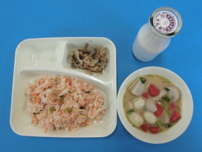 1月12日(火)、今日の給食は、正月の行事献立で「さけちらし、ぞう煮、れんこんのごまじょうゆ焼き」でした。