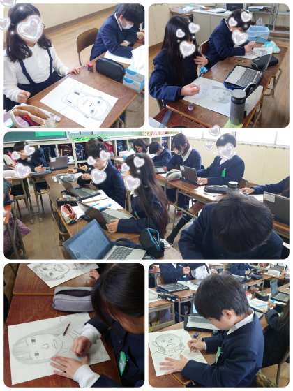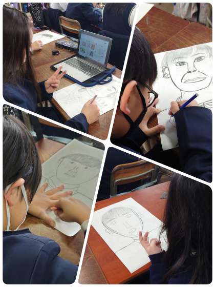 5時間目、4年生は、版画の下絵になる自画像を描いていました。どの子の作品もそっくりです。一目でだれが描いた自画像なのか分かります。分身の術でも使ったみたいです。顔に比べると手が小さくなってしまうので、顔と手の比べるように言ってみました。担任の先生は、手がポイントになるからよく見て描いてごらんとアドバイス。個性いっぱいの版画になるに違いないと作品の仕上がりを楽しみにしています。
