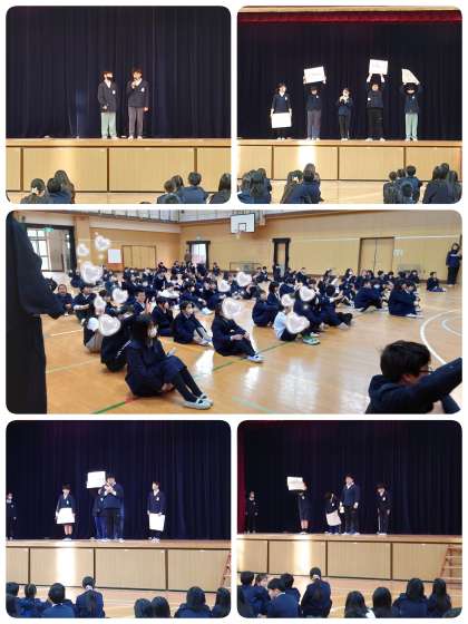 今日の児童集会は、給食委員会の子ども達が「給食クイズ」を出してくれました。クイズは全部で5問。問題を出す前に、問題につながる寸劇もしてくれました。とても楽しくて、みんながんばって練習したんだなと伝わってきました。