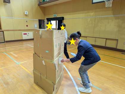 体育館の中を歩き回っていると、6年生の大きな声が聞こえました。そこは「とび出せ☆危機一ぱつ」という、段ボールの穴に「歯」を刺していき、中に隠れている健康委員が飛び出さないようにする取り組みをしていました!